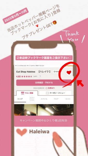 ブックマークしていただくと、マイページから当店のクーポン情報などを